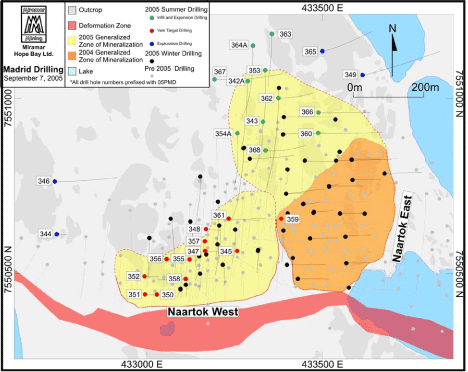 Vancouver, British Columbia - Sept. 8, 2005 - Miramar Mining Corporation (TSX:MAE)(AMEX:MNG) today announced more encouraging exploration results from the Naartok area of the Madrid deposit on its 100% controlled Hope Bay Project in Nunavut.