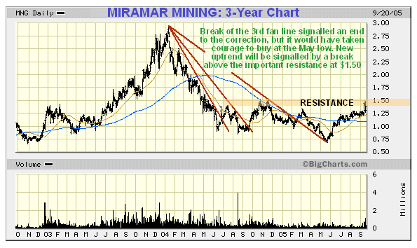 Another example of a more modest sized company whose stock is turning up and has a lot of upside potential is Miramar Mining. The 1-year chart does not reveal much of interest, so instead we will start with a 3-year chart. On this chart it can be seen that the price broke out above the 3rd fanline of a 3-arc fan correction last March, but then it deceptively fell to a new low in May, but found support above the 3rd fan line. This often happens with these fan lines, but it would have taken courage to buy at that point. This fanline correction appears to be a downsloping Handle to complement the large Pan, both of which can be seen on the 10-year chart. This is a fine example of a Pan base, although the Handle that followed the strong rally out of the Pan slopes down to an unusual degree. The signal for a strong rally in Miramar will be a break above the important resistance at $1.50 highlighted on the 3-year chart.