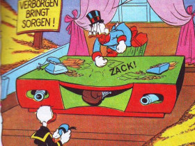 Hier geht es um Staatsverschuldung (Genussscheine auf Entenhausen bezogen), mit denen zunächst auf Pump finanziert wird, dann Schulden durch weitere Staatsanleihen herumgeschoben werden und letztlich eine Geldentwertung/Massenflucht einsetzt.