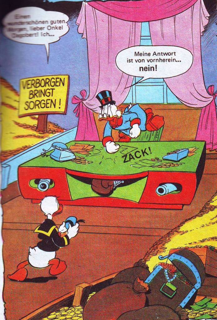 Hier geht es um Staatsverschuldung (Genussscheine auf Entenhausen bezogen), mit denen zunächst auf Pump finanziert wird, dann Schulden durch weitere Staatsanleihen herumgeschoben werden und letztlich eine Geldentwertung/Massenflucht einsetzt.