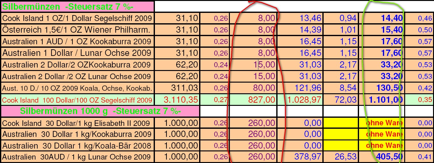 Hier mal ein Auszug der lieben Sparkasse. Da ist bei Silber garantiert schon die neue Steuer eingepreist. Dann klappst auch bald mit Steinbrück´s