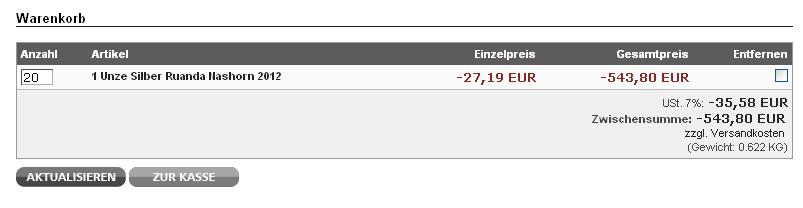 Folgendes Beispiel: Auragentum kauft bspw. aktuell die 1 oz Ruanda Nashorn für 25,42 EUR an, lege ich diese 20 x in den Warenkorb als Verkauf, werden die 7% MwSt. draufgeschlagen und der Ankaufspreis erhöht sich.