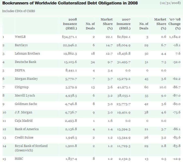 Es gibt aber inmitten all des Finanzchaos doch auch noch positive Meldungen von den deutschen Spitzeninstituten zu berichten. So konnte die von vielen schon abgeschriebene WestLB im vergangenen Jahr mit nur zwei einsamen Deals ihr Emissionsvolumen von CDO-Derivaten um satte 1884% gegenüber 2007 steigern, was Weltrekord darstellt.