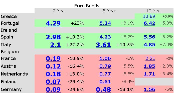 ZitatWegen des drohenden politischen Stillstands in Italien verschlechterte sich auch die Lage an den Anleihemärkten. Die Risikoprämien zehnjähriger Anleihen stiegen in Spanien um 0,4 Punkte auf 5,5 Prozent. In Italien stieg die Zehnjahresrendite um 0,36 Punkte auf 4,8 Prozent. In Portugal erhöhte sich die Rendite zweijähriger Staatsanleihen um 0,8 Prozentpunkte auf 3,7 Prozent.