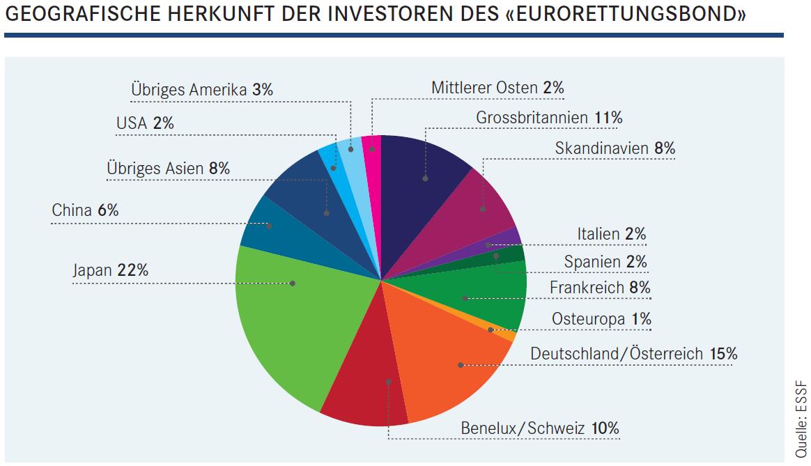 Am 25.01.2011 hatte der EFSF einen Rettungsbond für Irland in Höhe von 5,0 MrdEUR emittiert. 3,6 MrdEUR wurden an Irland überwiesen, 1,4 MrdEUR als Sicherheit zurückbehalten. Die Zeichner dieser Emission waren zu 50% Zentralbanken, Staaten und Staatsfonds, die anderen 50% waren institutionelle Anleger (davon nur 1% Hedgefonds). Hier die geografische Herkunft der Investoren...