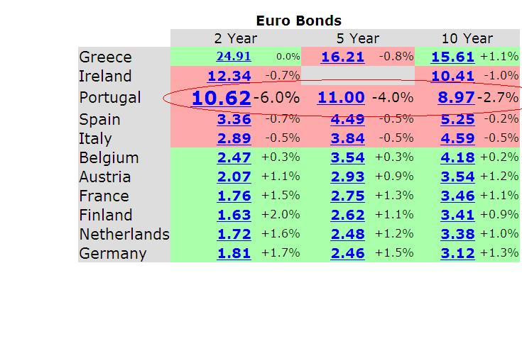 • So langsam, kommt eine sogenannte Umschuldung für den griechischen Schrottanleihen, in Gang. All zulange wird es nicht mehr dauern. Desweiteren geben die Zinsen für portugisische Schrottbonds kräftig nach, das war aber im letzen Jahr bei Griechenland, auch nicht anders. Wir wissen ja wo sie jetzt stehen.