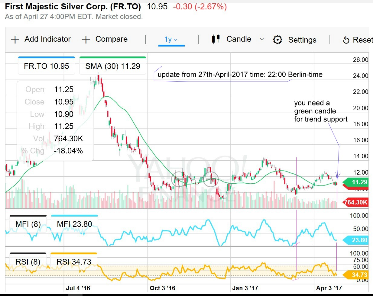 Der kräftige Ausbruch aus den Bollinger Bändern nach unten ist sicher keine Kaufempfehlung. Auch die anderen Indikatoren haben noch Platz nach unten. FR stieg von Januar 2016 von 3,80 C$ auf ca. 24 C$ im August 2016. Die Korrektur des 20 C$ Anstieges beträgt bisher 16 C$ oder 80 %. Handlungsbedarf sehe ich aktuell nicht. Die Anleger brauchen gute Nachrichten, um wieder Vertrauen zu finden.
