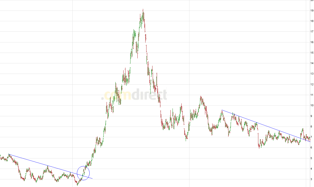 Somit ist AG nicht uninteressant auf aktuellem Niveau mit recht engem Stop (spätestens 6.20). Da liegen mit einem Stop von ein paar Prozenten mehrere hundert Prozent Performance drin....
