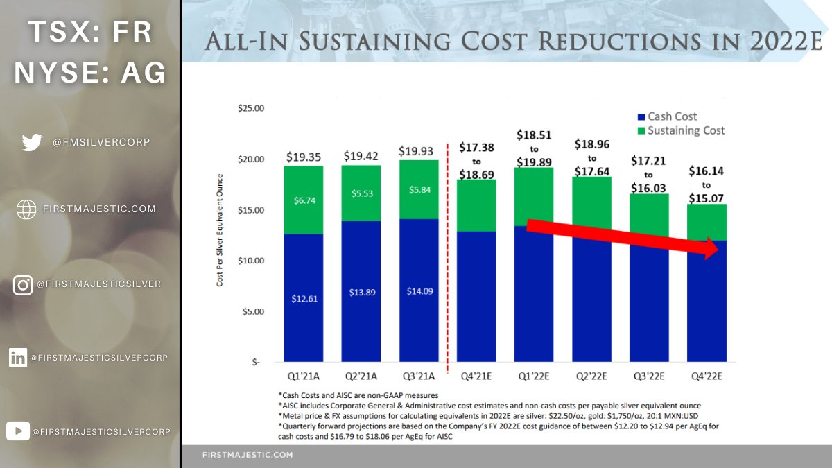 Präsentation vom Februar 2022 jetzt verfügbar. Siehe neu hinzugefügte Folie 12 "AISC-Reduzierungen in 2022E" unter Berücksichtigung der Inflation, gehört FMSilverCorp wahrscheinlich zu einer elitären Gruppe von Bergbauunternehmen (wenn nicht sogar die einzige), die eine Senkung der AISC-Kosten im Vergleich zu 2021 erwartet.