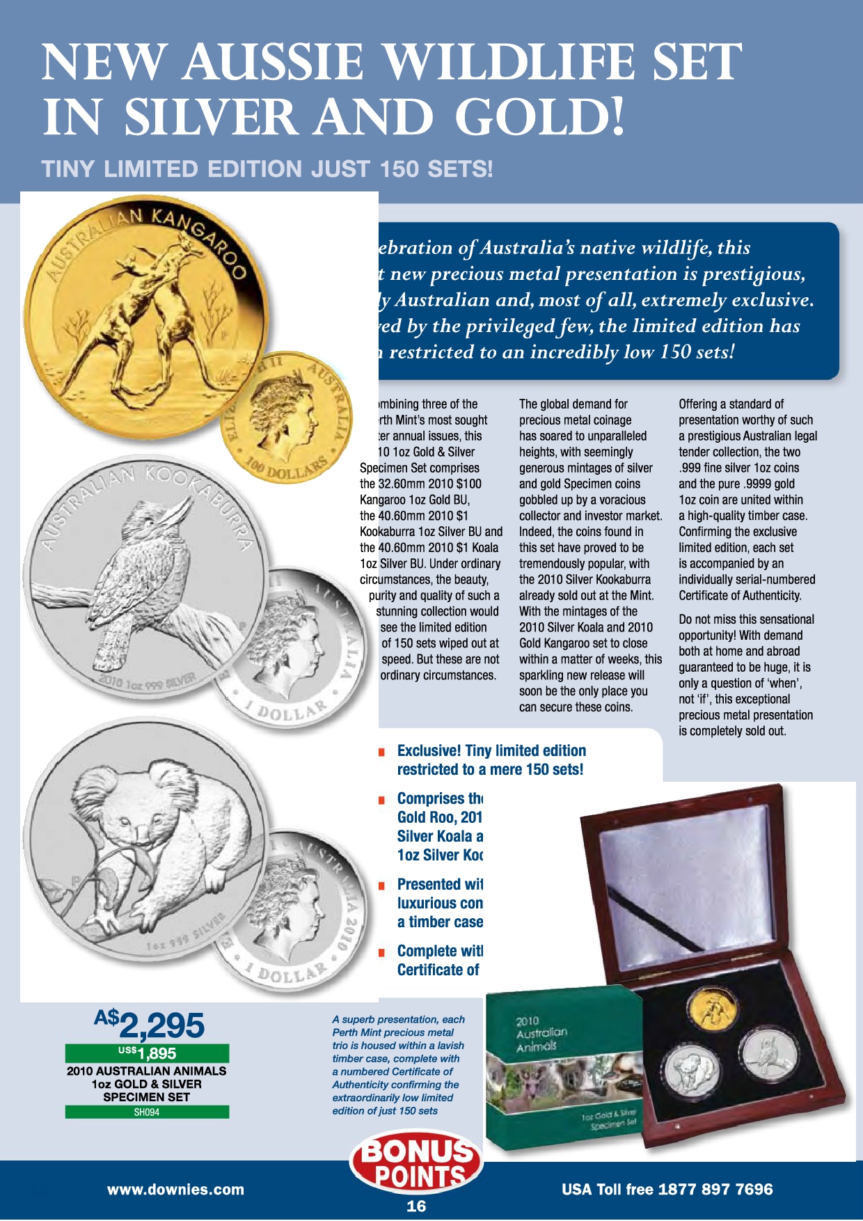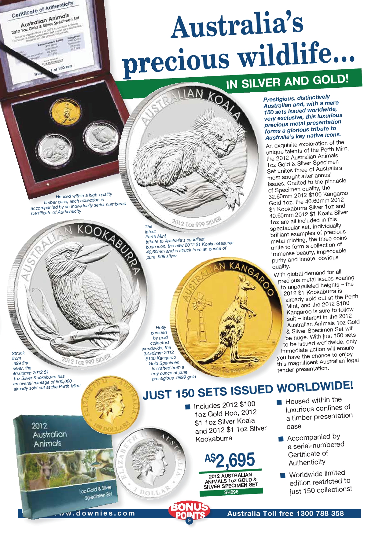 sowie einer 1oz Goldmünze des Kangaroo in einer Holzbox und mit Zertie und bedruckter Umverpackung ausgegeben.