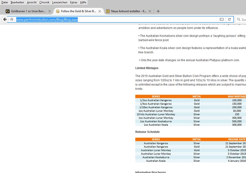 Die Zahlen der 2015er Auflagen der Perth Mint und die Updates zu den 2014er (laufen ja noch unter "sales to date") kommen erst gegen Ende Februar oder März.