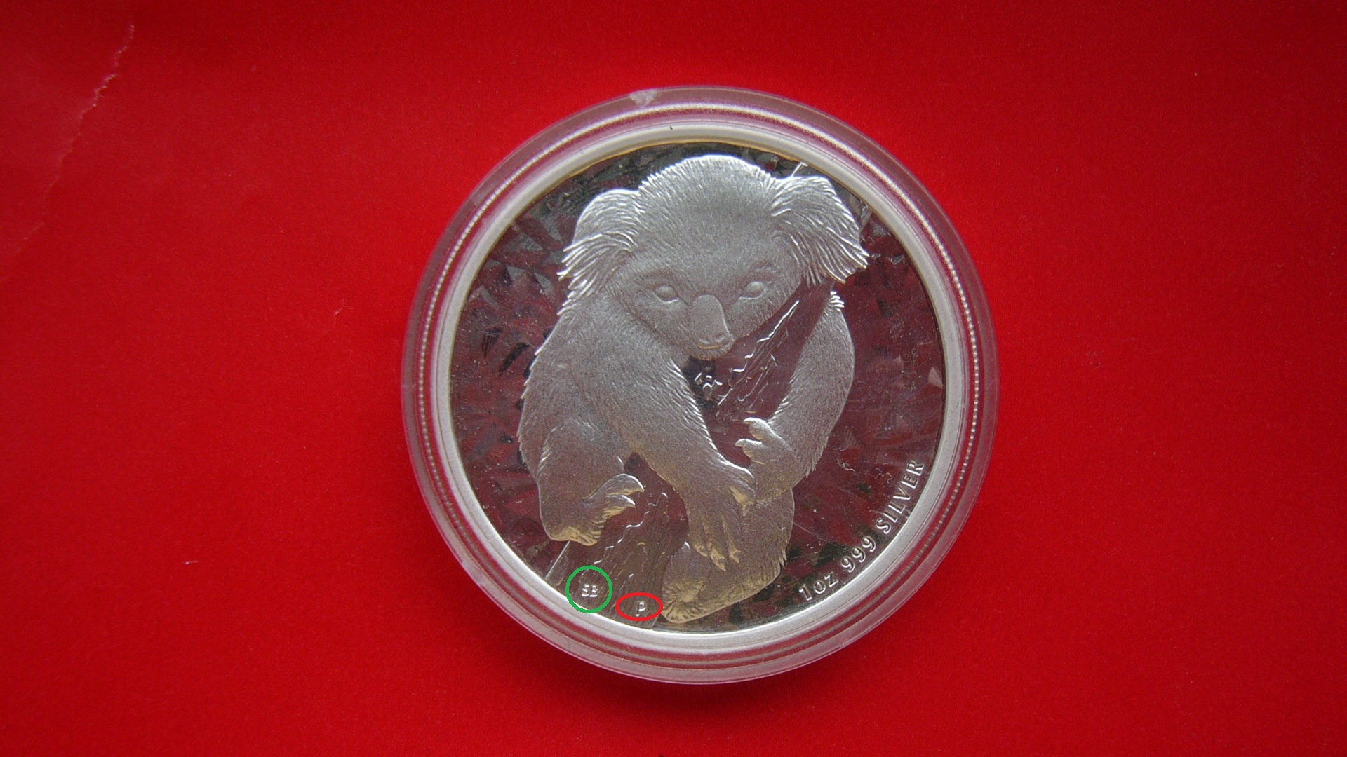 Ich habe hier mal das Designer-Kürzel der 2007er Erstausgabe (unten links auf der Münze) mit einem grünen Kreis markiert, das P-Mintmark in der roten Elipse ist das Kürzel der Prägestätte Perth Mint, welches seit 2007 auf allen deren Koala-Silber- und Gold-Münzen wiedergegeben wird (beim Kookaburra war es erst seit 2008 auf der Obverse-Seite der 1oz BU-Ausgabe und davor war es als der Proof-Ausweis bei den Kooka-Proofmünzen geprägt (einfach das Bild zum bessereren Erkennen anklicken). Eine Ausnahme war da noch der Jahrgang 1999, wo anlässlich des 100-jährigen Bestehens der Perth Mint P100 geprägt wurde. Mehr dazu im Blog von 2012 hier: http://blog.perthmint.com.au/2…istory-of-the-p-mintmark/