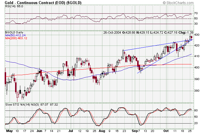 Auch im Wochenchart (gold-weekly.png) zeigt sich ein Dreieck, aus dem der Kurs ausbrechen könnte - sowohl nach oben, als auch nach unten. Letzeres scheint in Anbetracht der Tatsache, daß der Stochastik-Indikator sowohl im Wochen- als auch im Tageschart überkauft ist, für wahrscheinlicher . Der Stochastik im Monatschart steht derzeit auf steigende Kurse (aber der Monat ist ja noch nicht zu Ende).