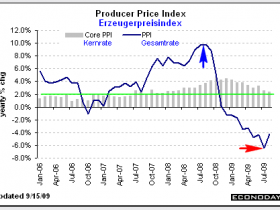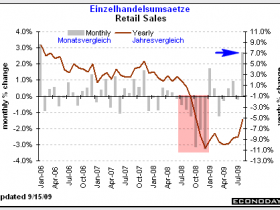 Die Einzelhandelsumsätze wiesen im August mit +2,7% (blauer Pfeil) den stärksten Anstieg in drei Jahren auf. Die Abwrackprämie im Autosektor und höhere Benzinpreise waren die wesentlichen Gründe hierfür. Aber auch ohne diese beiden Faktoren stiegen die Umsätze im August um 0,6%% im Vergleich zu -0,4% in Juli. Die ausgeprägte mehrmonatige Schwäche (rosa Markierung) während der zweiten Jahreshälfte von 2008 ist offensichtlich überwunden, auch wenn die Einzelhandelsumsätze immernoch 5,3% unter dem Vorjahresniveau liegen. Entscheidend ist jetzt, wie stark der Erholungstrend in vierten Quartal sein wird. Hier gehen die Meinungen deutlich auseinander. Der Verbraucher hat nach wie vor nicht genügend Geld, um aus eigener Kraft den Wirtschaftsaufschwung entscheidend zu stimulieren. Hohe Arbeitslosigkeit und deutliche Verluste am Immobilienmarkt bleiben kaum zu überwindende Hürden, sodass die Erholung ohne zusätzliche Stimulanzprogramme bescheiden ausfallen wird.