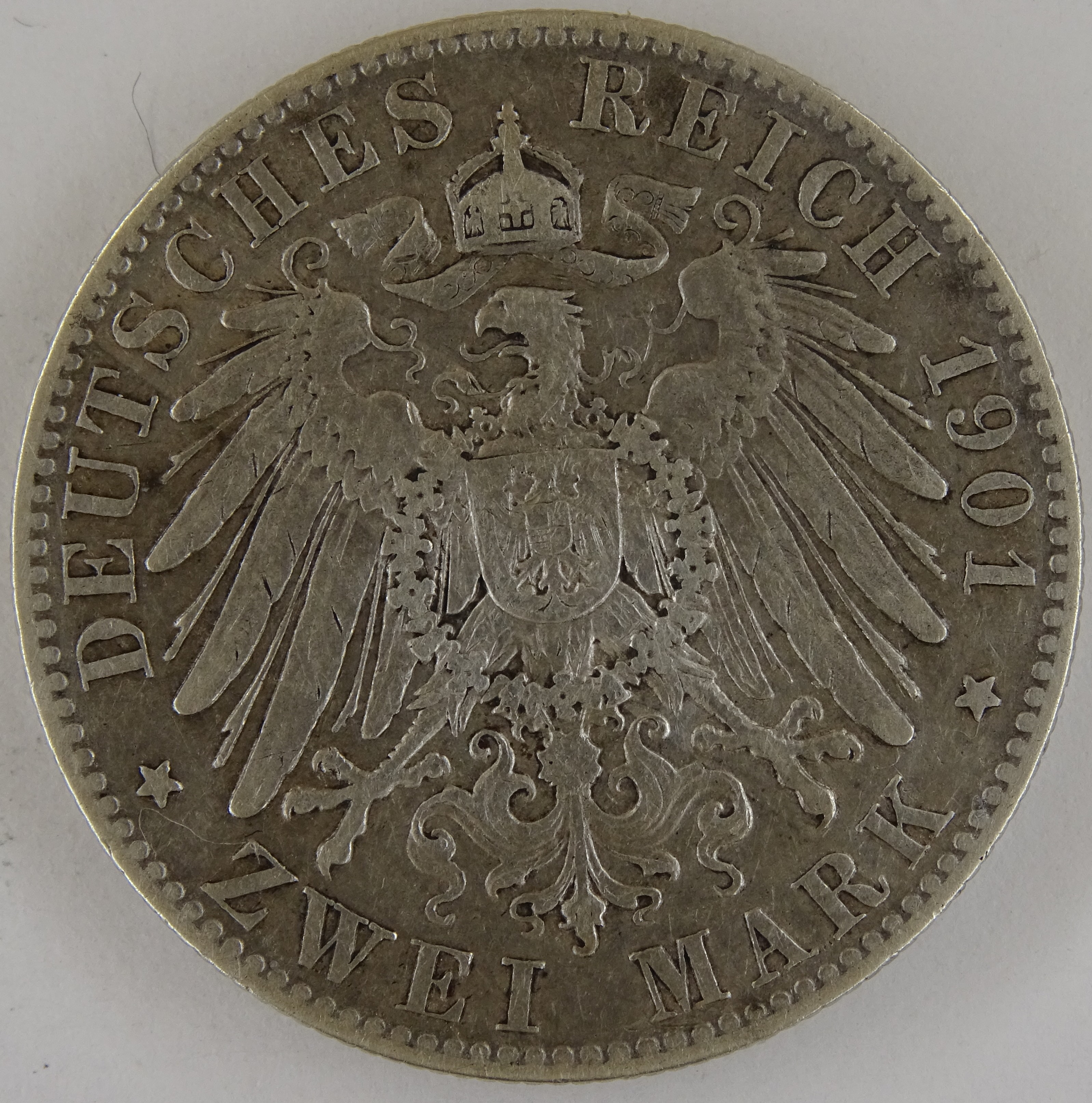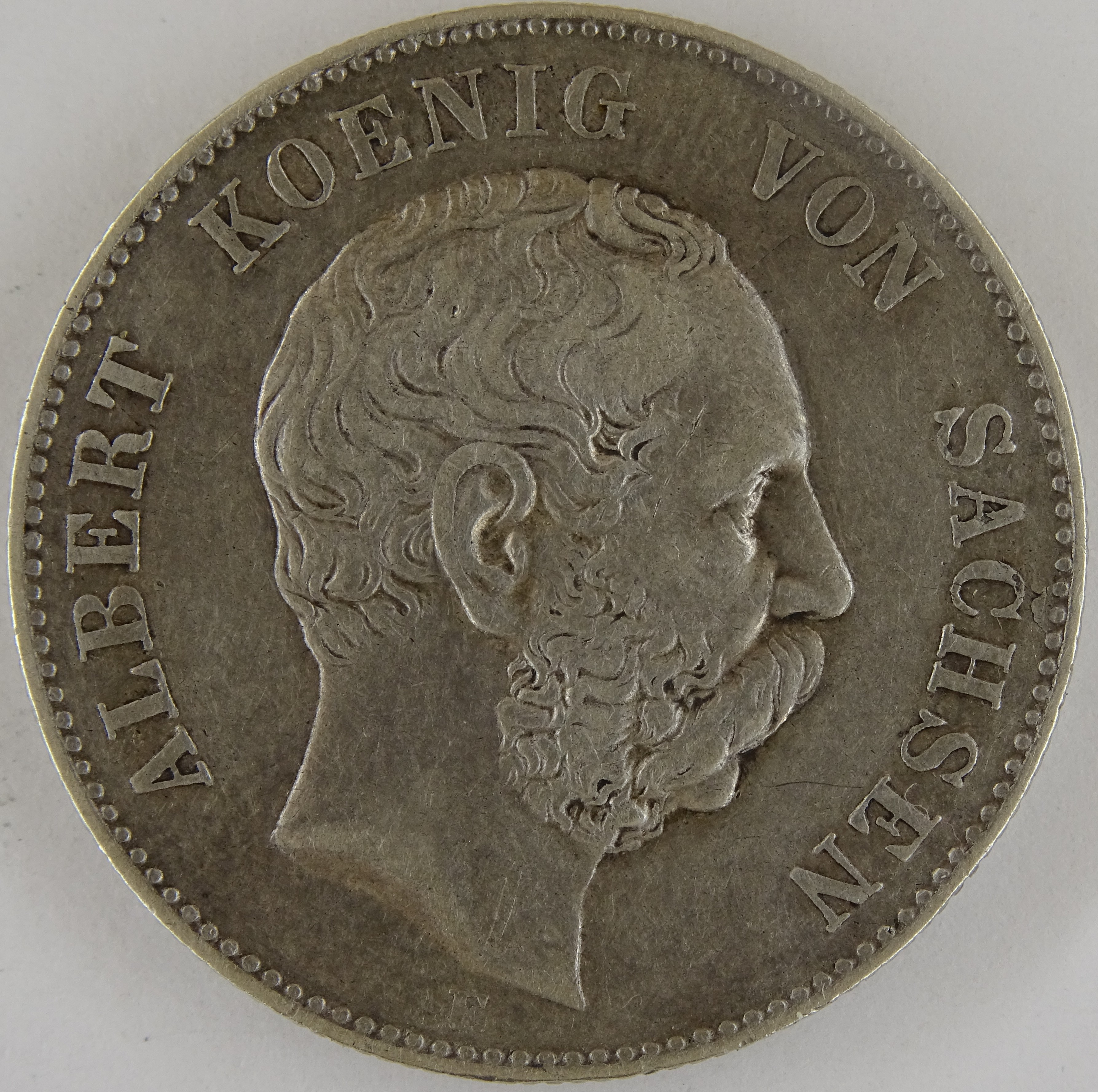 Hier präsentiert sich das Stück so, wie man es auch selbst in der Hand bei Tageslicht hält. Alle Fehler sind zu sehen, wirken aber nun weniger gravierend. Gerade der Kratzer wirkt nicht ganz so schlimm. Ebenfalls der Schrötlingsfehler beim C von Sachsen.