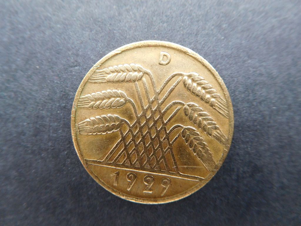 10 Reichspfennige.... schau mal ob Du einen 1932 G hast .... der würde bis zu 800 Euro bringen..... der gezeigt 1929 D .. je nach Zustand zwischen 1 Euro und 15 Euro