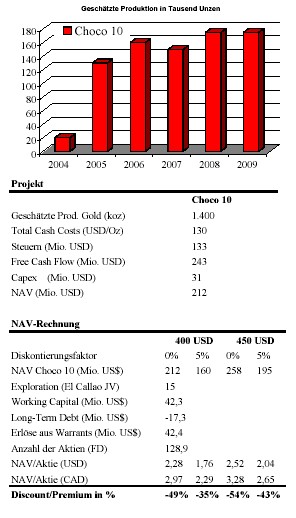 Das Choco 10 Projekt hat nach heutigem Stand eine relativ kurze Lebensdauer bis 2013. Allerdings zeigen aktuelle Bohrergebnisse in zwei neu definierten Mineralisierungszonen, Karolina und Villa Balazo, dass für Choco 10 weiteres Explorationspotential besteht. Nach Ansicht von Bolivar bilden diese Zonen zusammen mit Rosika eine einheitliche goldhaltige Struktur. Die hohen Goldkonzentrationen (z.B. 40,1 Meter @7,7 Gramm/Tonne auf Karolina) lassen einen gezielten Untertagebau möglich erscheinen. In unserer NAVRechnung ist dieses Explorationspotential nicht berücksichtigt.