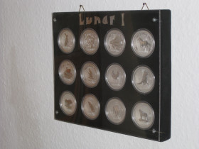 Mittlerweile (nach einem Jahr...*hust*) ist die Bastelarbeit tatsächlich fertig, ich bin mir aber einfach nicht sicher, ob ich das Teil tatsächlich dauerhaft an die hellste Ecke der Wohnung hängen soll (da siehts halt am besten aus :D ). Die älteren Lunar I - Münzen haben ja nun alle schon ein entsprechendes Alter. Sind die bei jemandem, der sie lange "draußen" hat liegen lassen, angelaufen?