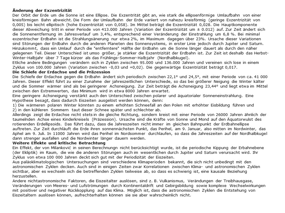 Dann eine Aufstellung einiger wichtiger periodischer Parameter, die für die Temperaturentwicklung massgeblich sind. Mit diesen Parametern hat der Jugoslawische Wissenschaftler Milutin Milanković die Perioden der Eiszeiten (unterste Linie in Schwarz) berechnet, lange bevor die praktische Wissenschaft sie nachweisen konnte. Es ist immer ein sehr erfreuliches Geschehen, wenn die theoretische Physik Dinge berechnet, die sich dann in der Praxis als richtig erweisen (Graphik davor).