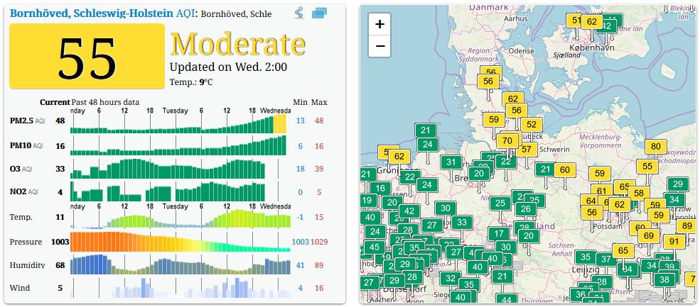 Ich bin auf eine "Realtime-Datenbank" gestossen, die die weltweiten Mess-Stationen abbildet. Nun habe ich mir Berlin einmal vorgenommen und oh Wunder - Allerbeste Luft an allen Stationen. So quasi Luftkurort an der See ...