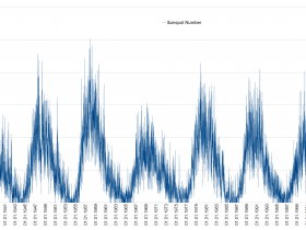 Und guckt man sich dann mal einen Graphen der Sonnenaktivität an, stellt man verblüfft fest, dass diese Ereignisse nach genau dem gleichen Zyklus verlaufen. Da kann man auch gerne noch weiter zurück als 2007 gehen, zum Beispiel kurz vor 2000, oder die goldenen 1920er.