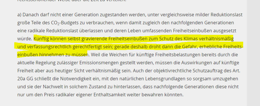 Das bedeutet doch nichts anderes als die Ermächtigung zum Klima-Lockdown. "Selbst gravierende Freiheitseinbußen zum Schutz des Klimas verhältnismäßig und verfassungsrechtlich gerechtfertigt" ist der Persilschein für die Öko-Diktatur. Na danke auch.