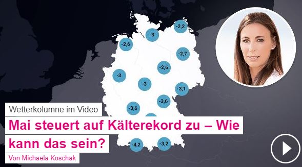 in dem Erklärbär-Film wird schön brav beschrieben, warum der April und auch vermutlich der Mai die jeweils kältesten Monate seit 40 Jahren sind. Sie fragt süffisant, ob denn nun die Klimaerwärmung ausfalle, um dann gleich zu verneinen. Die paar kalten Monaten würden leider keine Trendwende darstellen. Wortwörtlich: "Klima sind mindestens 30 Jahre und da sind so ein paar Monate gar nix" Was für eine Koryphäe