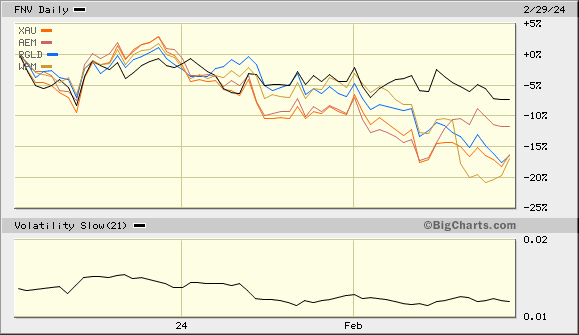 Wie zuvor dargestellt, hatte FNV historisch auch zuvor erhebliche Vola. Seit dem Zwischentief bildet sich m.E.ein Boden mit leichtem Vorteil vs den großen Peers und XAU, sh.Chart.