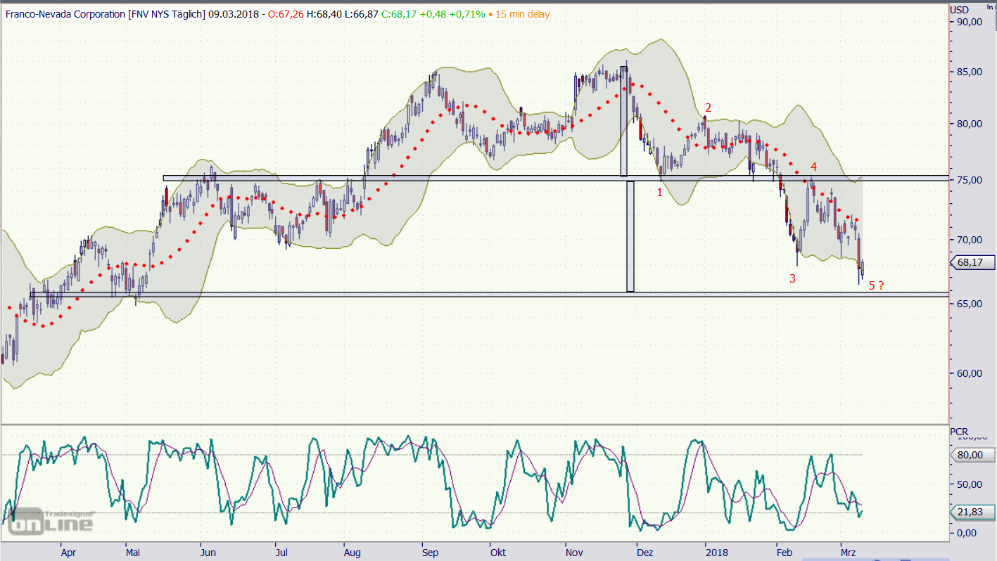 Der Bruch der wichtigen Unterstützung bei 75 USD Ende Januar war negativ. Häufig gibt es noch einmal eine Gegenreaktion zur alten Unterstützungszone (von 3 zu 4). Wenn man die Differenz Unterstützungszone zum alten Hoch von Ende Nov. 2017 nach unten spiegelt, ergibt sich ein Ziel von ca. 65 USD. Dort liegt auch eine Unterstützung aus dem April 2017.