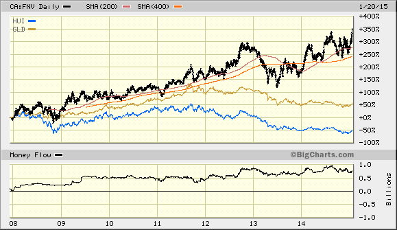 "Jordan Roy-Byrne (12/1/14) "Franco-Nevada Corp. is so well capitalized and it has been making a ton of deals over the last 12–18 months. Franco is making money and adding more streams and attributable production. Its stock has held up really well in a difficult time. . .The one thing with Franco is that it tends to outperform at the very end of bear markets and then at the beginning of bull markets. This is a stock that should continue to perform really well, and if gold goes up, as I believe it will, it will benefit greatly, as will its partner companies. A higher gold price means that Franco won't have to worry about its partners getting into trouble."