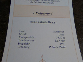 Bei den Krügerrand Münzen der ersten beiden Jahre sind Proof und stempelglanz Exemplare oftmals nur an der Riffelung am Rand zu unterscheiden. Proof Exemplare haben 220 Kerben, bei stempelglanz sind es nur 180.