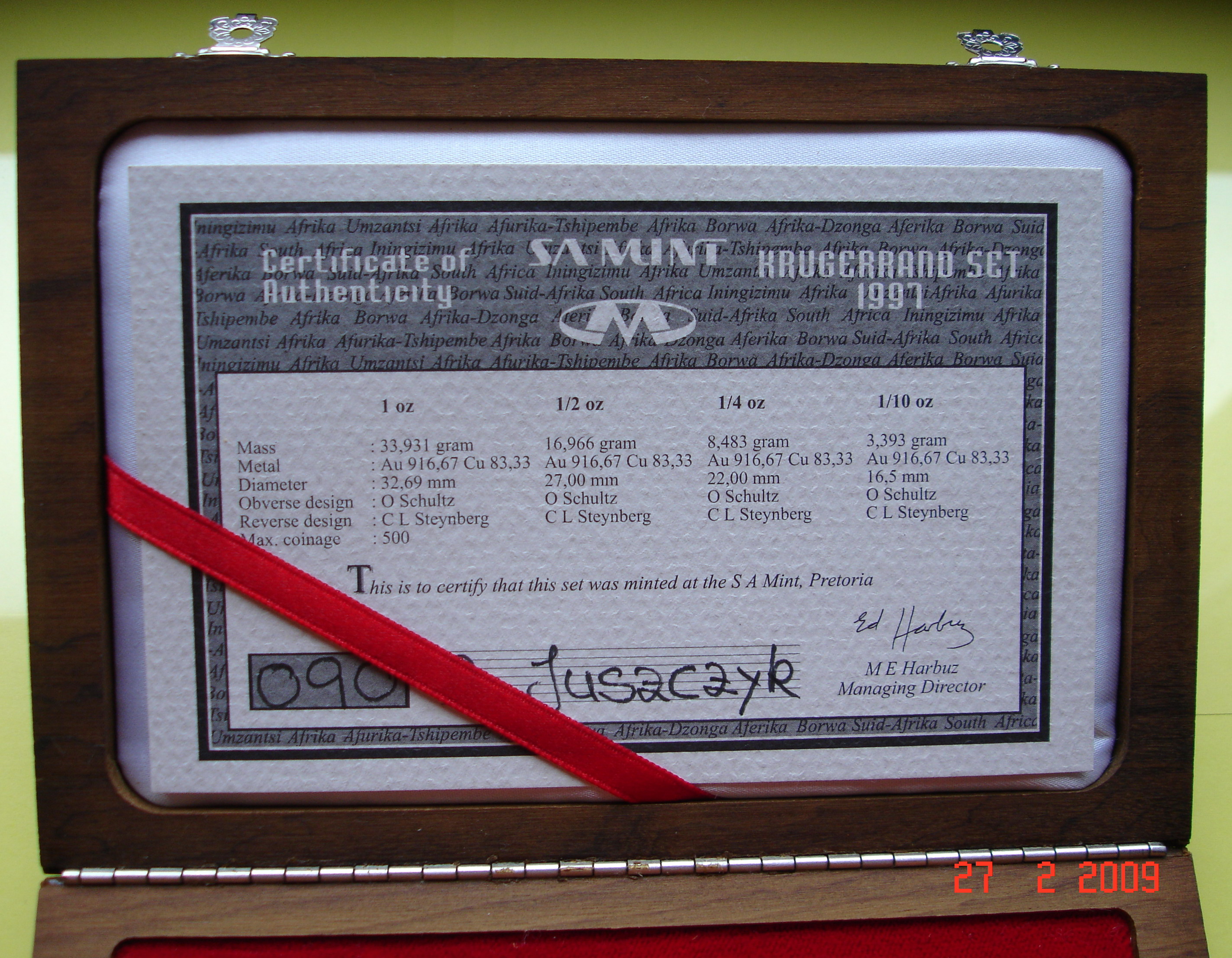 Ich habe ein farbiges COA "Krugerrand Set 1997" das zu einem "30 Year" Krugerrand Set in roter Lederbox gehört und kann damit die "97er Set-Reihe" ergänzen.
