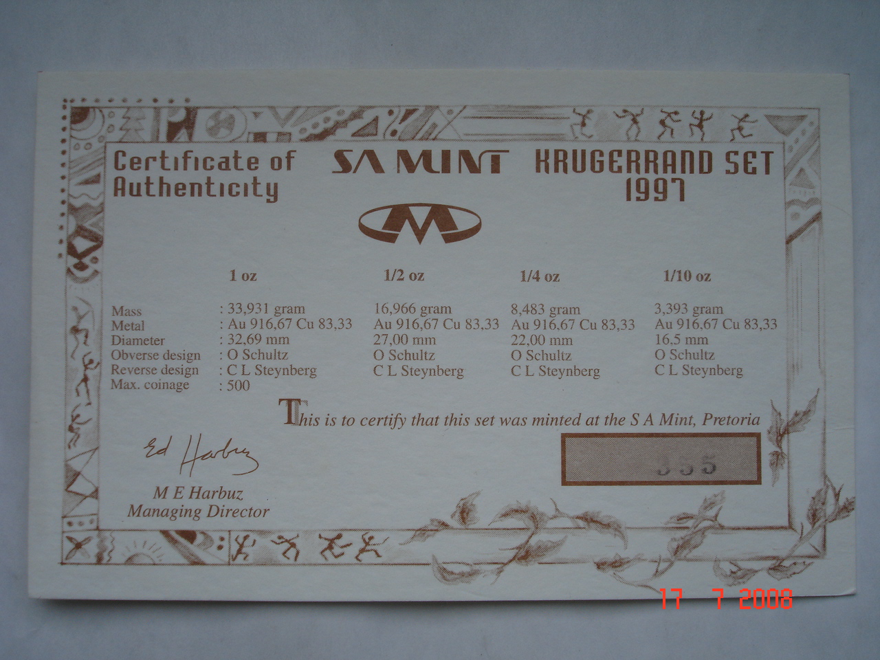Ich habe ein farbiges COA "Krugerrand Set 1997" das zu einem "30 Year" Krugerrand Set in roter Lederbox gehört und kann damit die "97er Set-Reihe" ergänzen.