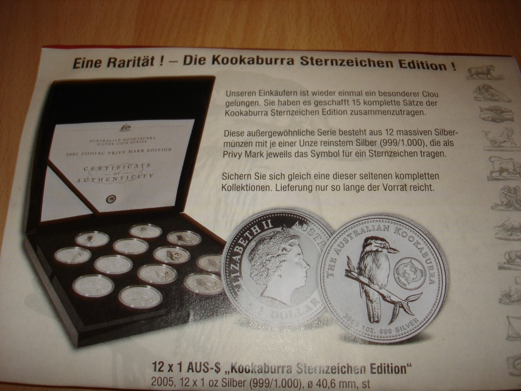 Kannte ich bisher überhaupt nicht... Geschweige denn mal überhaupt irgendwo mal gesehen... eine Kookaburra Sternzeichen Silber Serie aus dem Jahre 2005 ??? Ist das eine Originale Ausgabe der Perth ??? Er hatte den Flyer dieses WE im Briefkasten gehabt für 395 Euro... Kennt da jemand noch andere Bezugsquellen..??