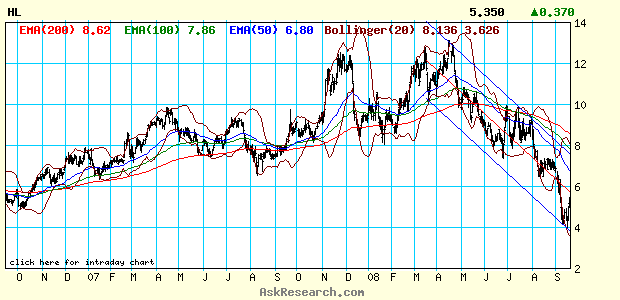 ""n 2007, Hecla was the lowest-cost primary silver producer in North America, producing 5.6 million ounces of silver at an average total cash cost of negative $2.81 per ounce. Hecla also produced 107,708 ounces of gold. The company has exploration properties and operating mines in the U.S. and Mexico. Hecla’s proven operating expertise, recent acquisitions, low-cost growth profile and excellent exploration potential emphasize Hecla’s position as a low-cost, low-risk silver investment...."Grüsse
