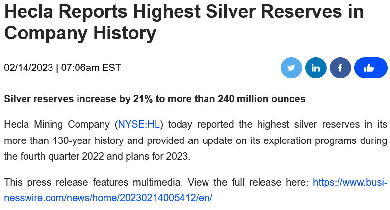 Baker fügte hinzu: "Angesichts der starken Betriebsleistung in den letzten neun Monaten in allen unseren Minen erhöhen wir unsere Produktionsprognose für 2022. Unser Produktionswachstum macht Hecla zum am schnellsten wachsenden etablierten Silberproduzenten, wodurch wir unsere Führungsposition als größter Silberproduzent in den USA weiter ausbauen und das Potenzial haben, auch der größte Silberproduzent Kanadas zu werden."