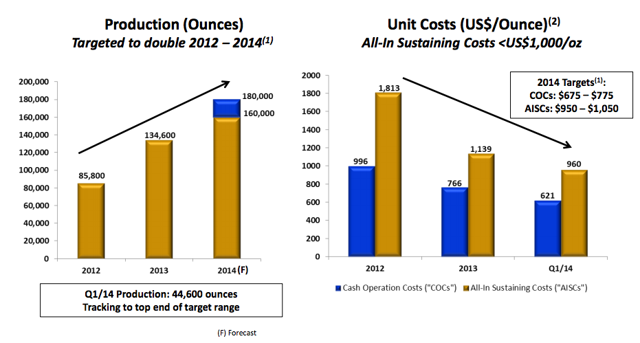 Following this payment, we have total cash and bullion of approximately $50 million and expect to grow our cash position throughout the year through internally generated cash flow. With our strengthening balance sheet, we are well financed to fund all of our capital, operating and exploration programs through the end of 2014 while also continuing to pay down debt, with a target for total debt repayments in 2014 of $25 million....“