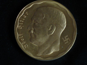 Auf der Vorderseite befindet sich ein Abbild von Adolf Hitler (im Profil). Die Rückseite zeigt das Brandenburger Tor. Links unten ist die Name oder Begriff "Prode" zu finden. Ich habe bereits verschiedentlich im Netz recherchiert, Angaben zu der Münze fand ich jedoch keine.