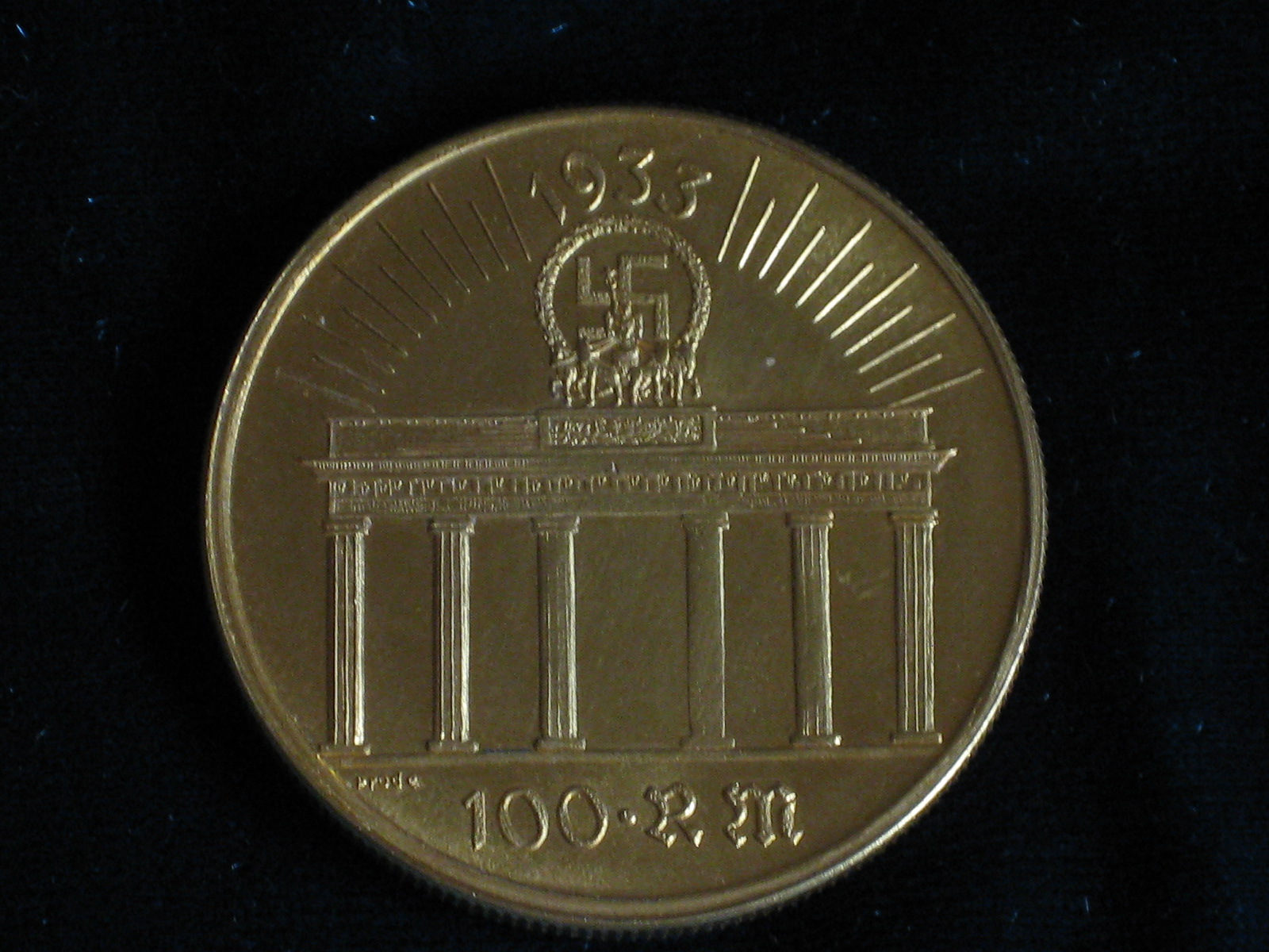 Auf der Vorderseite befindet sich ein Abbild von Adolf Hitler (im Profil). Die Rückseite zeigt das Brandenburger Tor. Links unten ist die Name oder Begriff "Prode" zu finden. Ich habe bereits verschiedentlich im Netz recherchiert, Angaben zu der Münze fand ich jedoch keine.