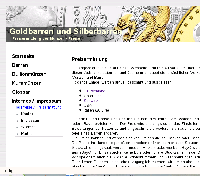 Das soll wirklich kein Spam sein, ich wollte euch nur unsere neue Seite zum Thema Bullionmünzen und deren Marktpreise vorstellen. Mittlerweile steckt einige Arbeit in der Preisdatensammlung und der grafischen Auswertung. Ich würde mich sehr über Kritik und Verbesserungsvorschläge freuen, insbesondere zur Charts Oberfläche.