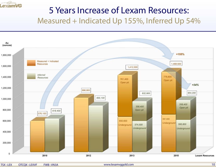 LEX wird mit 3 % des Goldes M&I in situ bewertet, das ist äusserst gering, zumal 777 000 oz davon Open Pit sind. Und wie ersichtlich, mit steigender Tendenz, ähnlich wie zB. bei Gold Standard ist der Großteil der Gebiete noch nicht exploriert.