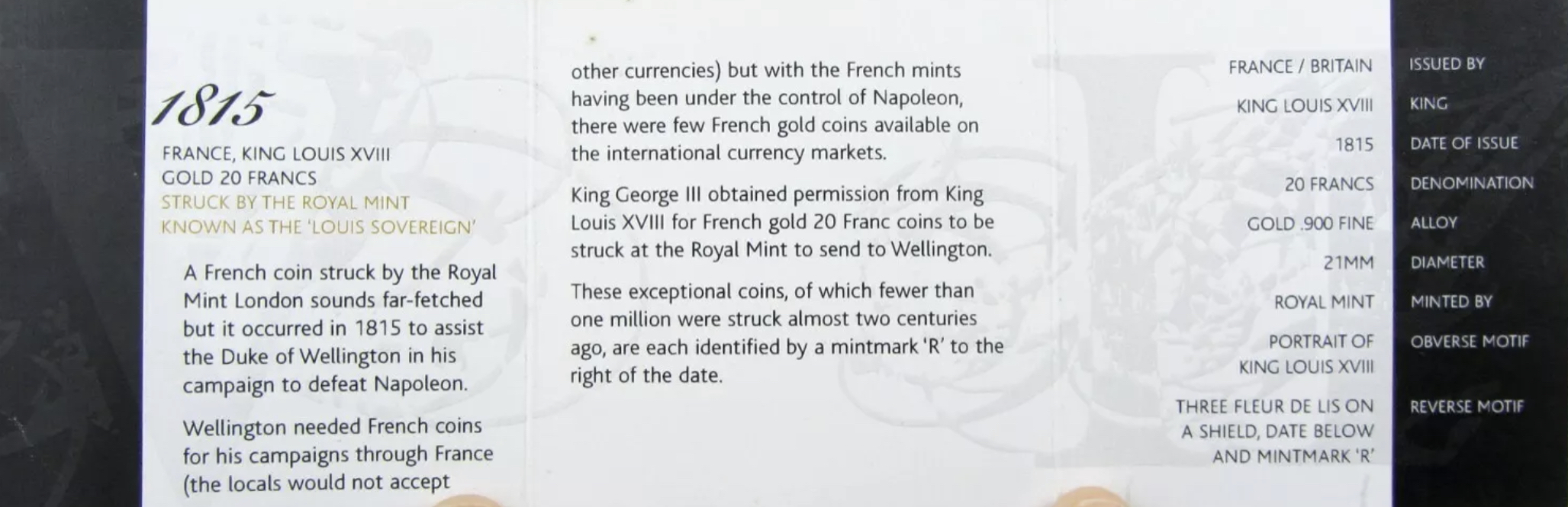 Ebenfalls hatten die Rothschilds den Auftrag, die in London geprägten 20-Francs-Stücke zu den auf dem Kontinent stehenden Truppen zu transportieren.