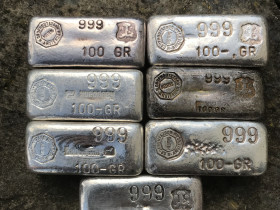 7 verschiedene Varianten der 100 Gramm Drijfhout Silberbarren.