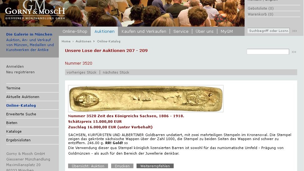 Oha, das Stück stammt wohl aus dem Königshaus Sachsen und ist um 1850 hergestellt worden! Vor ein paar Jahren wurde ein etwas schwererer Barren für 39000 Euro versteigert!