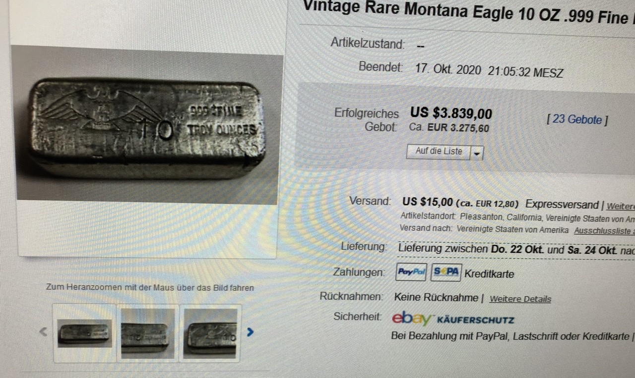 Vor ein paar stunden wurde in einer amerikanischen barrengruppe bei facebook ein 4,65 unzen silberbarren für über 2500 follar versteigert!