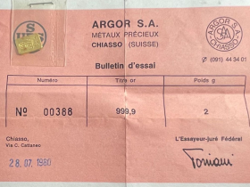 @octron: Mein Barren kam mit dem doppeltgroßen, angehefteten Zertifikat, handgestempelt auf Juli 1980. (Diese "angetackerten" Zertifikate kannte ich sonst nur von Valcambi.) Die eingeschweißten rosafarbenen UBS-Zertifikate kenne ich nur mit eindeutig gewalzten Barren (und ja, mit Seriennummer auf der Rückseite).