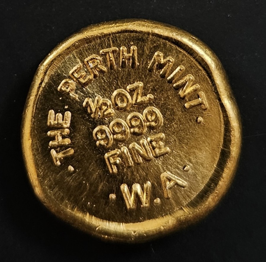 Der gegossene kleine Goldbarren in runder Form, älterer Ausgabe, von einer halben Unze (1/2oz) wurde ab 1976 von der Perth Mint gegossen. Das Maß beträgt etwa 16,0 x 5,0 mm. Die ältere Ausgabe ist unter anderem daran zu erkennen, dass das Logo der Perth Mint, der goldene Schwan, nach links schaut.