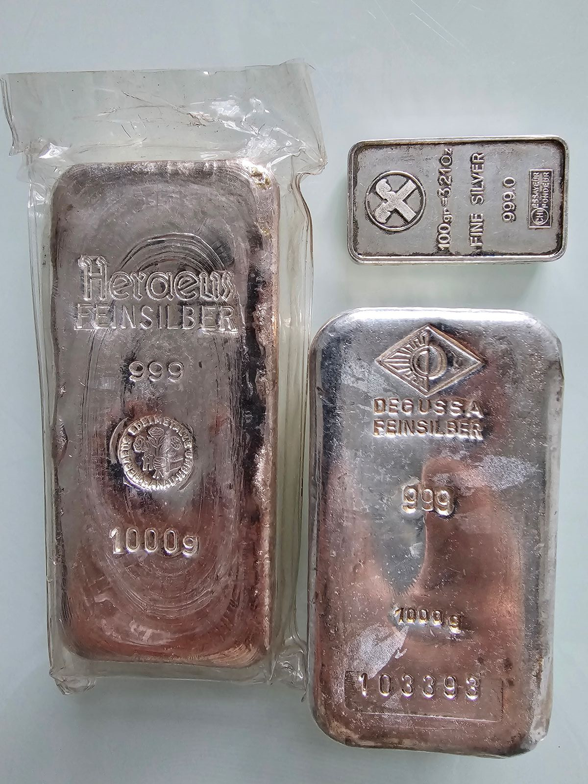 Bzgl der 1kg dachte ich auch, dass die etwas älterer Bauart sind. Beide nur 999, altes Heraeus Logo, der Degussa Barren mit Seriennummer...