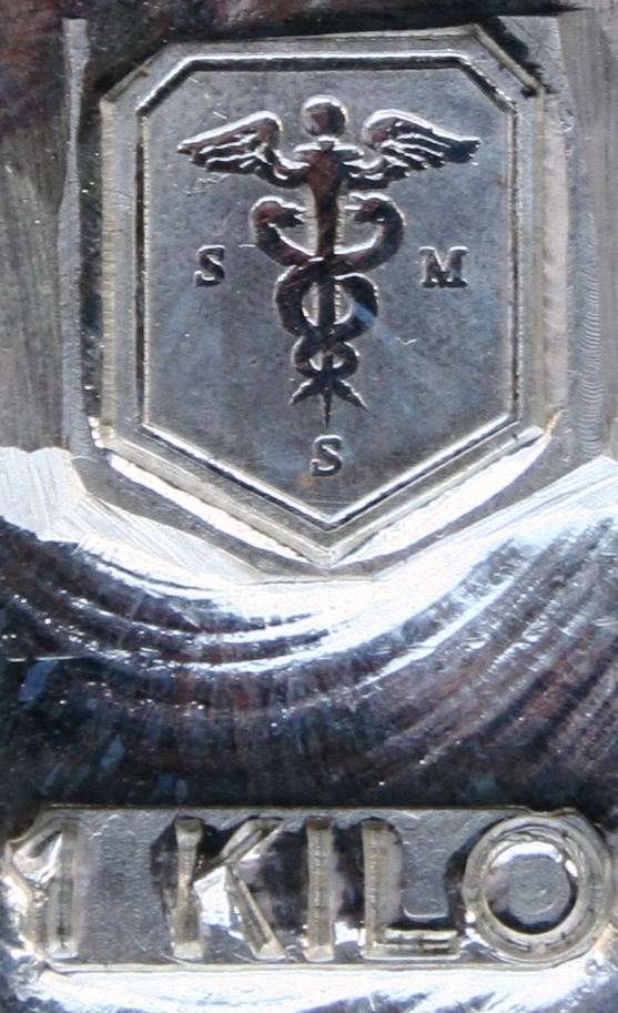 in Ergänzung der Beiträge 121 / 144 ( bullion-treasure ) konnte ich heute eine weitere Variante der 1 Kilo Schöne-Silberbarren entdecken und vereinnahmen. Abweichend von allen mir bekannten Barren mit dem Tauben-Logo trägt dieser eine Punze mit Stab und Schlangen.