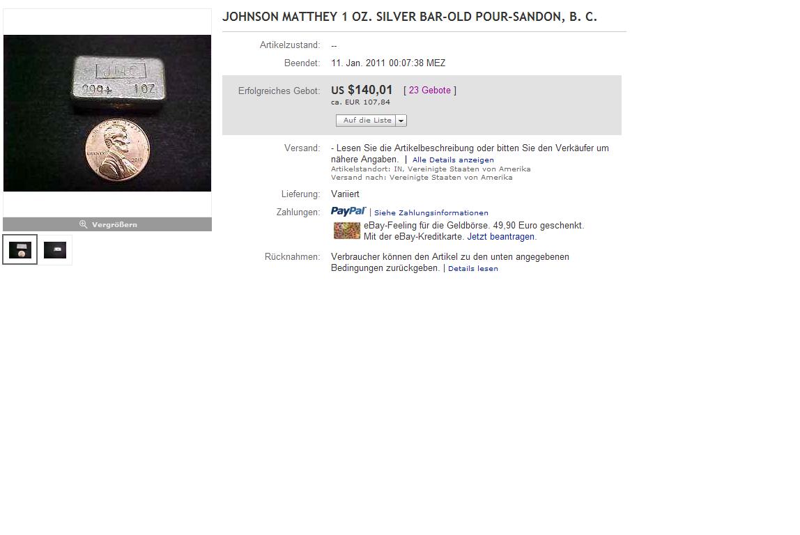 Am 24.01.11 ist nochmals ein zweiter - 1 Oz. AG Barren aus gleicher Quelle aufgetaucht....das Ergbnis beider Auktionen nochmals im direkten Vergleich s.u.